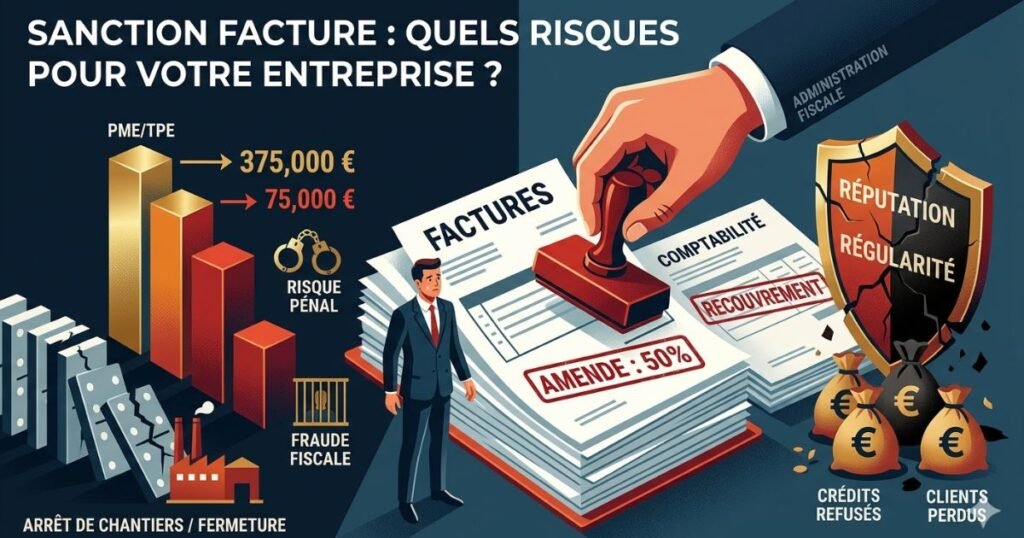 | Défaut de facturation | 50 % des sommes reçues | 75 000 € à 375 000 € d’amende |